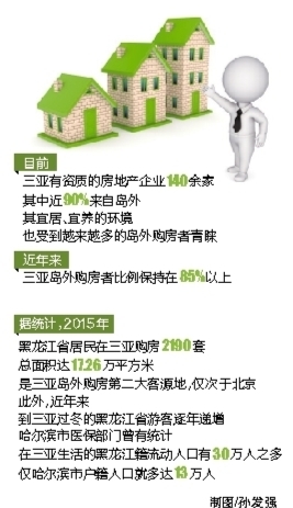据统计,2015年黑龙江省居民在三亚购房2190套,总面积达17.26万平方米,是三亚岛外购房第二大客源地,仅次于北京。此外,近年来,到三亚过冬的黑龙江省游客逐年递增,哈尔滨市医保部门曾有统计,在三亚生活的黑龙江籍流动人口有30万人之多,仅哈尔滨市户籍人口就多达13万人。