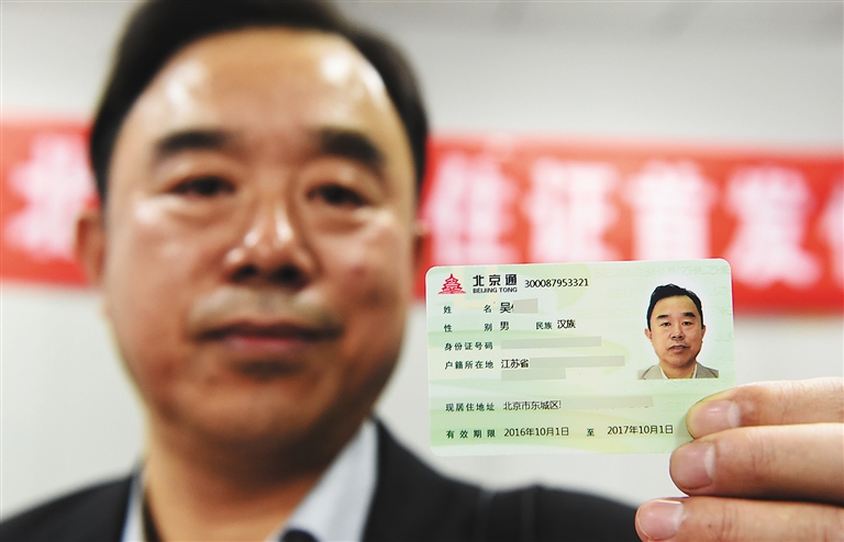 10月14日,吴先生展示《北京市居住证》。 当日,北京市首批居住证在北京市公安局东城分局前门派出所“诞生”,目前北京市已累计受理来京人员申领《北京市居住证》超过6万件。 新华社记者 李文 摄