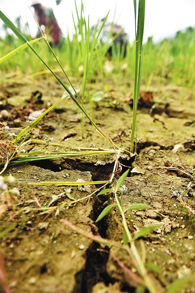 广西融水县融水镇小荣村农民在抢收受旱田地的农作物(10月14日摄)。 受近期降雨减少影响,广西部分地区出现旱情。目前,广西110个县(市、区)中有57个发生不同程度气象干旱,其中重旱2个,中旱23个,轻旱32个。 新华社记者 张爱林 摄