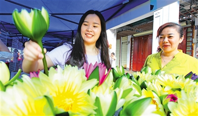 10月15日,由共青团海口市委承办的“青创助力 产业融合 共促发展”海口市青年创业市集系列活动在海口鸣锣开市,吸引众多市民前来赶集“淘宝”。图为在莲花茶故事汇展台,市民在选购莲花。本报记者 张茂 摄