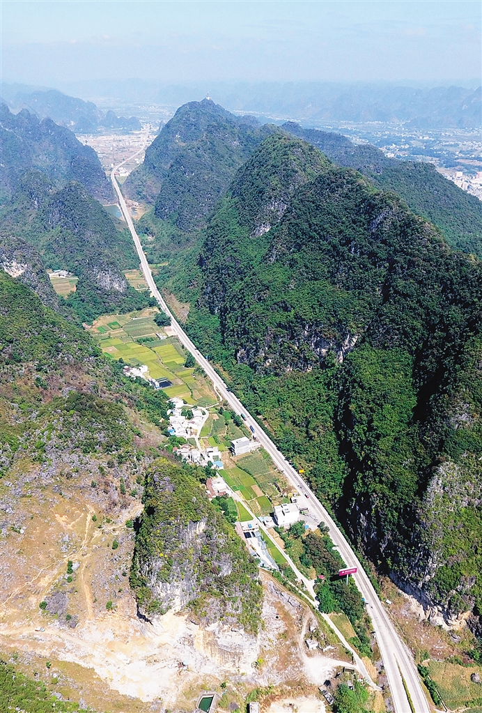 这是从都安瑶族自治县县城附近经过的高速公路(10月14日摄)。 广西都安瑶族自治县总面积4095平方公里,石山面积占89%。至2015年末,全县70.2万人中仍有13.67万人未能脱贫,脱贫成本高、脱贫任务重。“要致富,先修路。”这个自治县在1955年成立之初,公路总里程只有70公里。多年来,当地各级党委、政府和各族群众在崇山峻岭间开山凿石,修筑起一条条脱贫路。 至2015年底,全县道路里程已达1726.322公里,条条纵横瑶山的公路,为脱贫致富提供了更加快速的通道。 新华社发