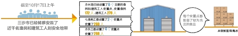 随着设市4年多来基层政权建设的推进,三沙抵御气象灾害的能力也在不断提高。今天中午1时,在设施齐备的永兴居委会安置点,已经有110多名大人和小孩在这里避风,渔民村木板房里的人员已经全部转移出来了。