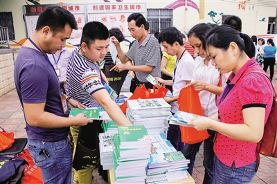 10月17日,在海口市龙桥镇举办的“扶贫济困 你我同行”扶贫宣传日活动上,工作人员向农户发放各类农业科普书籍。本报记者 李幸璜 摄