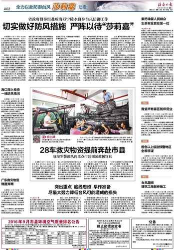 海南日报 全力以赴防御台风莎莉嘉·动态 002 2016-10-181 2016年10月18日 星期二
