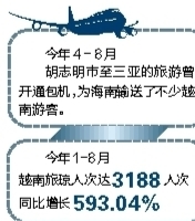 据了解,海南高度重视开发越南市场,今年4-8月胡志明市至三亚的旅游曾开通包机,为海南输送了不少越南游客。今年1-8月,越南旅琼人次达3188人次,同比增长593.04%。根据航空公司计划,河内直飞海南海口的航班将于11月1日开通,每周二、周四、周六各1班。此外,本着“航线开通到哪,宣传促销做到哪”的原则,我省将在越南最主要的三个城市河内、胡志明、海防市投放海南旅游广告,以提高海南的知名度和美誉度。越南游客前往海南旅游享受落地签证的特权,随时可以乘飞机抵达。