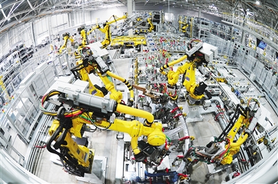 10月18日,机器人在北京现代沧州工厂焊接车间生产线上工作。 当日,北京现代沧州工厂生产的首款车型VERNA下线并上市。这标志着京津冀协同发展战略实施以来,体量最大的项目正式竣工投产。新华社记者 牟宇 摄