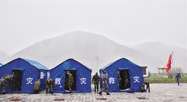 10月18日,武警青海总队玉树支队官兵在杂多县政府院内冒雪搭建救灾帐篷。 10月17日15时14分,青海省玉树州杂多县发生6.2级地震,震源深度9公里。中国地震局、青海省地震局已派出现场工作队赶赴震区协助当地政府开展应急处置工作。 新华社发