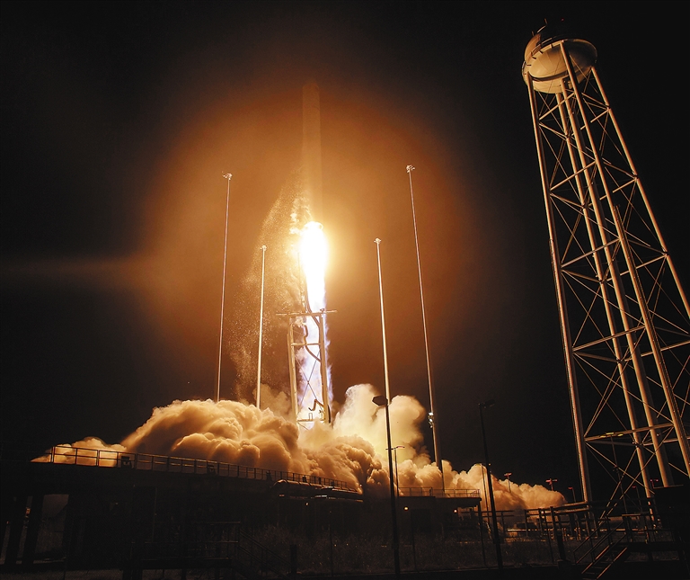 10月17日,升级版“安塔瑞斯”火箭托举着“天鹅座”飞船从美国弗吉尼亚州的瓦勒普斯航天发射场升空。 在发射爆炸事故发生约两年后,美国轨道ATK公司17日重返美国东海岸弗吉尼亚州,利用换了发动机的“安塔瑞斯”火箭发射“天鹅座”飞船,执行第六次国际空间站货运任务。 新华社/路透
