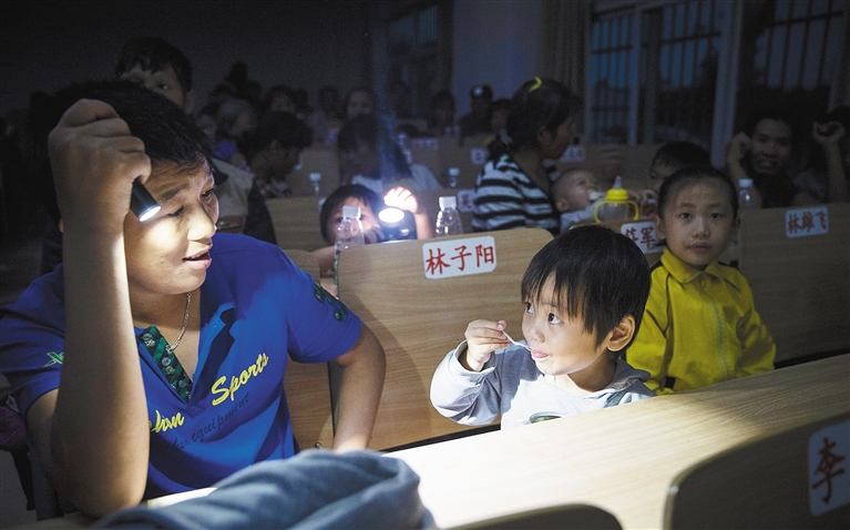 在台风“莎莉嘉”袭来之前,我省及时转移居住在危房、低洼地带、山洪灾害易发区群众。图为18日晚6时30分,在儋州市东成中学安置点内,3岁的陈靓颖正在家人照料下,安心享用当地干部送来的晚餐。本报记者 宋国强 摄