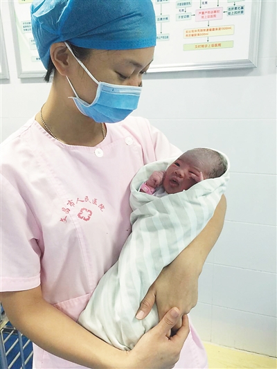 11时10分产妇被送到海口市第四人民医院。13时20分,她顺利产下了健康的宝宝。