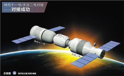 经北京航天飞行控制中心就对接准备状态进行最终确认,神舟十一号开始向天宫二号缓缓靠拢。3时24分,神舟十一号与天宫二号对接环接触,在按程序顺利完成一系列技术动作后,对接机构锁紧,两个飞行器建立刚性连接,形成组合体。