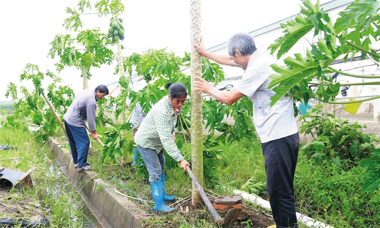 10月19日下午5时许,文昌市潭牛镇中心村地气蔬菜园产销专业合作社,村民将被台风刮倒的农作物扶起加固,抓紧灾后生产恢复。