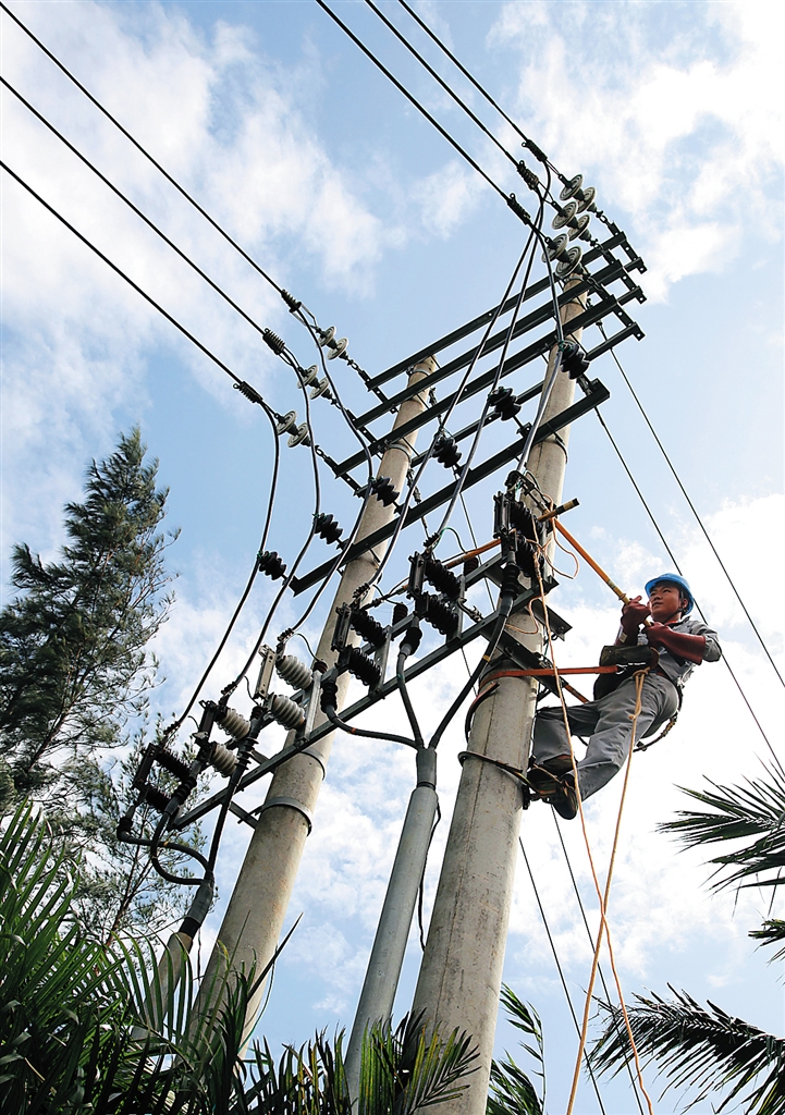 10月19日上午11时许,文昌供电局文城供电所抢修队正在抢修因台风损坏的线路,并扶正被压走位的横担。