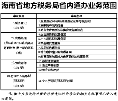结合我省实际,税务登记、优惠办理、宣传咨询等4大类13项217小项涉税事项纳入办税事项省内通办: