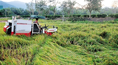 10月19日18时许,保亭黎族苗族自治县新政镇毛文村番那村民小组,村民正在操作农机抢收倒伏的水稻。受强台风“莎莉嘉”的影响,保亭9个乡镇水稻受灾面积达2.258万亩。台风过后,农户抓紧时间抢收水稻,以挽回损失。