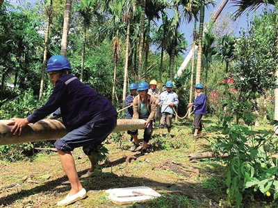 台风过后,山区部分输电线路被树枝打坏,大风将电杆吹断,必须更换电杆。19日上午,因为保国乡部分路段多处塌方,摩托车过不去,冲山供电所员工黄基真和几位村民一起走了30公里的山路,摸排线路故障,就是为了尽快装好电杆,恢复送电。
