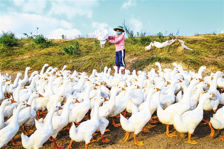 10月11日,在定安县新竹镇白堆村委会同古村,农户在池塘边饲养定安鹅。自从“定安鹅”获得了地理标志证明商标注册证书后,该村农户积极养鹅促进增收,目前该村有40户农户养鹅,年出栏量23万只。近年来,定安县委、县政府积极引导当地农民通过养鹅实现脱贫致富。目前,定安全县鹅的年出栏量有250万只,年纯收入高达5000万元。本报记者 张茂 摄