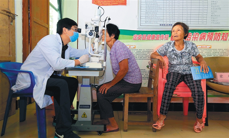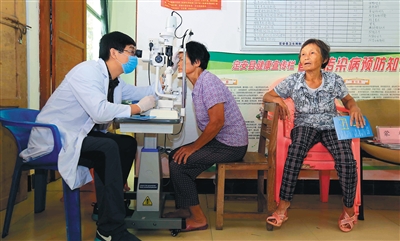 目前,我省现有的贫困农民中,有部分是因病致贫。海南省卫生和计划生育委员会结合“送医送药送温暖”健康扶贫工作活动,对各市县建档立卡,对农村贫困患者入户一对一进行病情评估,提出治疗方案,方便实行分类分级针对治疗。图为10月17日,在定安县雷鸣镇山地村委会,海南省卫生系统的健康扶贫医疗队深入乡村,为村民义诊。 本报记者 陈元才 摄