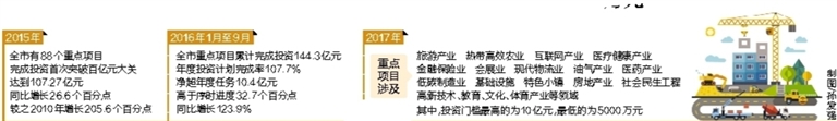 “十二五”以来,儋州重点项目投资与年俱增。2015年全市有88个重点项目,完成投资首次突破百亿元大关,达到107.27亿元,同比增长26.6个百分点,较之2010年增长205.6个百分点。今年1月至9月,全市重点项目累计完成投资144.3亿元,年度投资计划完成率107.7%,净超年度任务10.4亿元,高于序时进度32.7个百分点,同比增长123.9%。