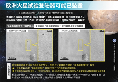 总部位于法国巴黎的欧洲航天局21日宣布,美国航天局火星勘测轨道飞行器拍摄的一张火星表面图像,很可能捕捉到了日前在着陆火星前突然“失踪”的欧洲火星试验登陆器“斯基亚帕雷利”的踪影。据画面内容分析,“斯基亚帕雷利”可能在降落时“不幸坠毁”。新华社发