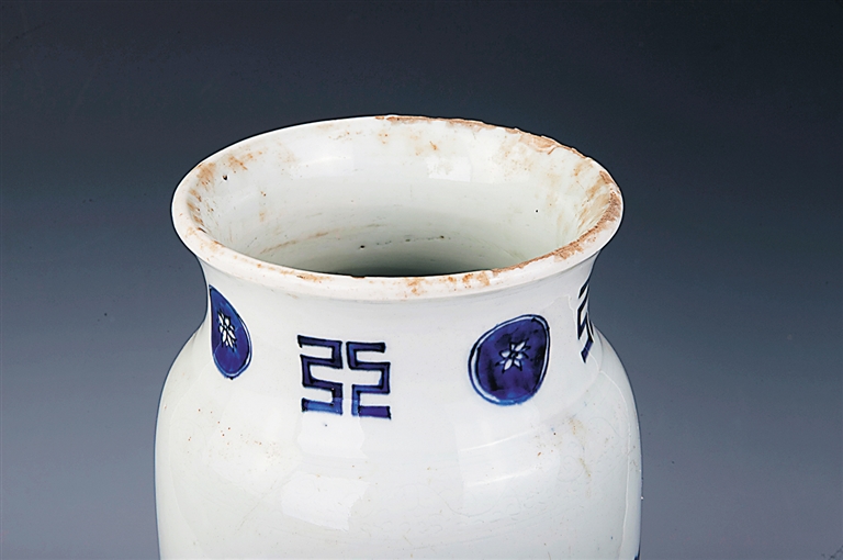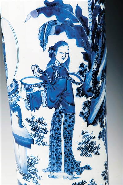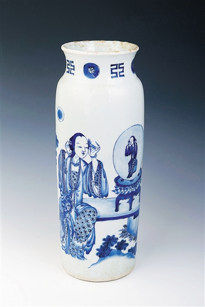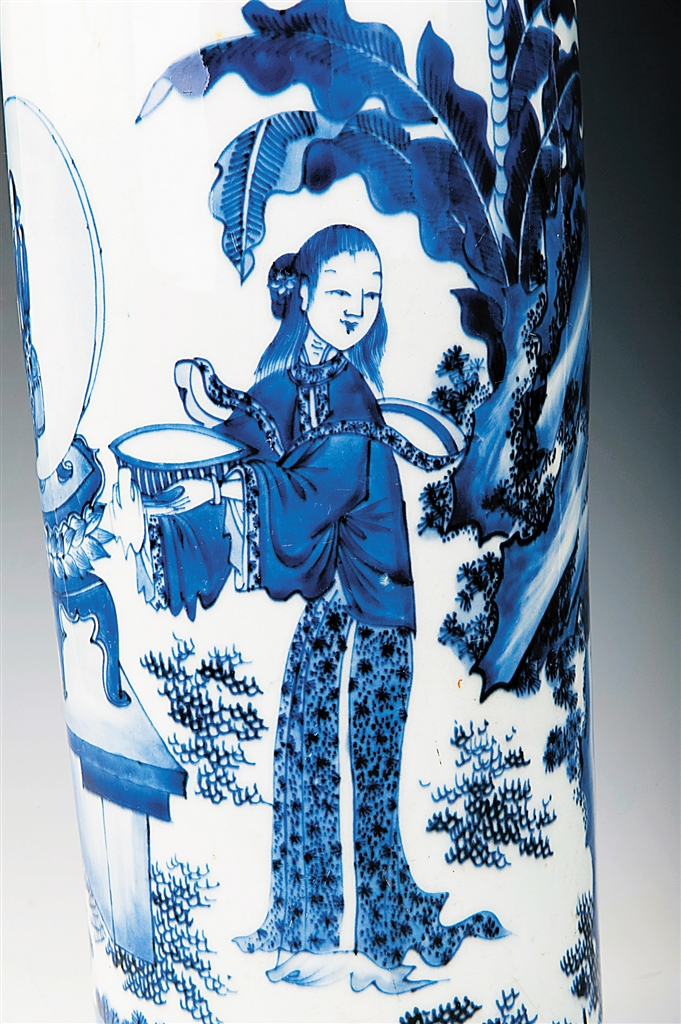 过渡期瓷器强调主体图案,弱化工艺性边饰。过渡期瓷器给主体图案最大化的空间,如果走近这个明代青花仕女图筒瓶细看,在肩足两个部位,确有暗刻边饰。但这一暗刻装饰手法,远观不碍图案整体性,近看别有一番新意,饶有趣味。