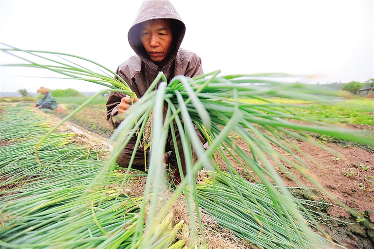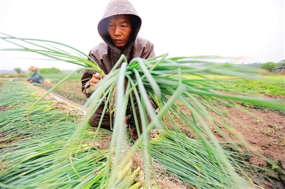 22日9时许,临高县临城镇头星村委会罗文村村民苏红和往常一样,来到罗文村常年蔬菜基地,把事先捆扎好的一百斤大葱以每斤1.5元的价格卖给了收购商。他仔细数了数钱,告诉记者,“固定来我们村的收购商有三四个,种葱啊,不愁卖!”