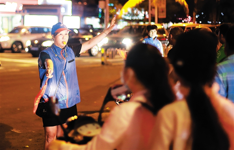 10月24日19时许,海口市南沙路与海德路交汇处,一位志愿者大姐在维护交通秩序。