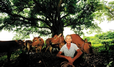 10月21日,在海口市旧州镇旧州村,贫困户周汝贵牵着政府帮扶他的5头黄牛,乐不拢嘴。今年,当地政府补贴他3万元用于买黄牛,另外还给他送去100只鸡苗。如今,黄牛逐渐长大,母鸡也即将下蛋,脱贫希望在即。本报记者 陈元才 摄