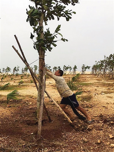 2013年8月,台风到来之前,叶兴彬专门组织人手给每棵树培土500斤左右,用于加固树木。尽管如此,台风“蝴蝶”过境时,还是将岛上所有新种的树木刮倒。