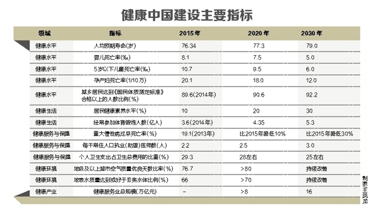 党和国家历来高度重视人民健康。新中国成立以来特别是改革开放以来,我国健康领域改革发展取得显著成就,城乡环境面貌明显改善,全民健身运动蓬勃发展,医疗卫生服务体系日益健全,人民健康水平和身体素质持续提高。2015年我国人均预期寿命已达76.34岁,婴儿死亡率、5岁以下儿童死亡率、孕产妇死亡率分别下降到8.1‰、10.7‰和20.1/10万,总体上优于中高收入国家平均水平,为全面建成小康社会奠定了重要基础。同时,工业化、城镇化、人口老龄化、疾病谱变化、生态环境及生活方式变化等,也给维护和促进健康带来一系列新的挑战,健康服务供给总体不足与需求不断增长之间的矛盾依然突出,健康领域发展与经济社会发展的协调性有待增强,需要从国家战略层面统筹解决关系健康的重大和长远问题。