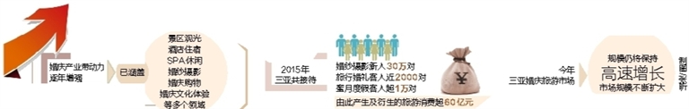 近年来,三亚婚庆产业带动力逐年增强,已涵盖景区观光、酒店住宿、SPA休闲、婚纱摄影、婚庆购物、婚庆文化体验等多个领域。据不完全统计,去年三亚共接待婚纱摄影新人30万对、旅行婚礼客人近2000对、蜜月度假客人超1万对,由此产生及衍生的旅游消费超60亿元,预计今年三亚婚庆旅游仍将保持高速增长,市场规模不断扩大。
