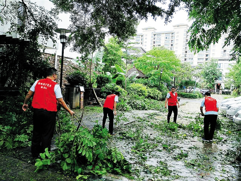 抗台期间,无数鲁能员工冒着风雨在小区中修剪即将折断的树杈、清理道路中的积水和路障、封堵容易渗水的部位、检查物资的储备情况,尽可能降低造成的损失。有的员工手机泡水、车辆损坏;有的员工一直在狂风暴雨中工作,全身湿透已经不算什么,伤风感冒也是在所难免。
