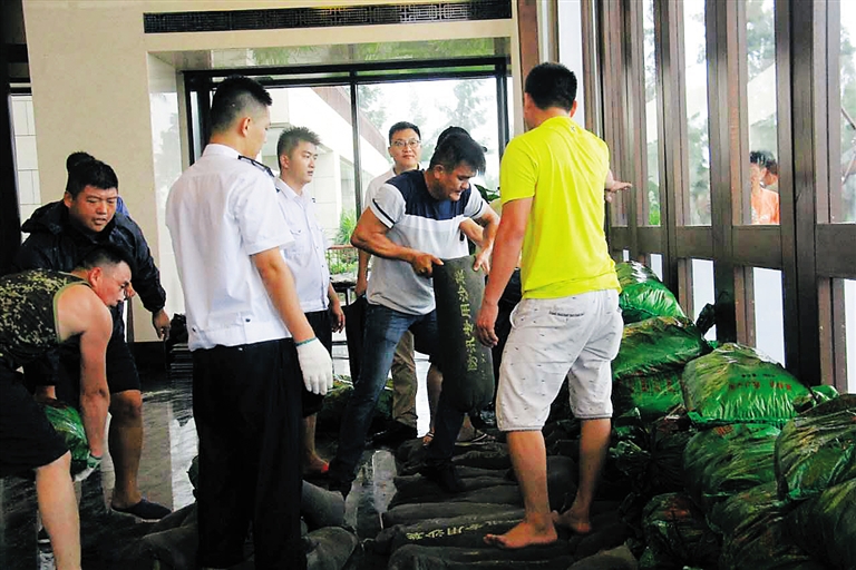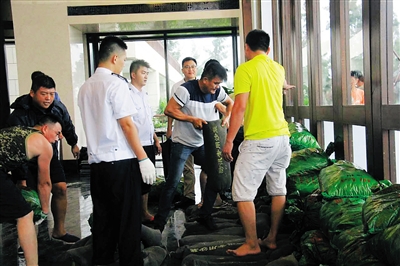 在短时间内,鲁能全体员工即刻到岗,投入到防汛工作中。沙袋、雨具等防汛物资迅速到位,并发放到各项目员工手中;地下室排水设施迅速配备齐全;建立起24小时值班制度,对工地脚手架扣件稳固情况、垃圾清理情况、临时设施稳固情况、临时用电运行情况等防范要点进行巡视排查;玻璃门窗、广告板等重点部位也快速搭好了防护工具。