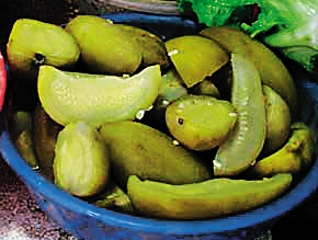 关于东方酸瓜的做法,旧时制作酸瓜的原料似乎与现在的不一样。过去大都用的是无籽黄芯西瓜皮。先是挖掉西瓜里面多余的西瓜“内脏”,再是把西瓜皮劈成一小片一小片的,然后放进一个箩筐里,加进适量的盐调和,搅拌,达到一定时辰后,取出压挤掉多余的水,再装进另一密封的坛子里腌制,需要腌制三天以上方能食用。现在的酸瓜都选用初长成的嫩皮小西瓜,这种瓜的肉质粉软,不费牙。