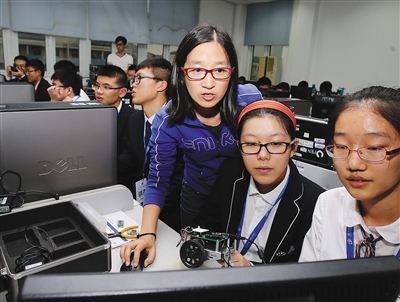 10月26日,中学生们在交大教师的指导下,进行机器人组件和编程。 当日,来自全国的100名具有科创特长的中学生走进上海交通大学,在实验室和学生创新中心老师的指导下,学习机器人组件和编程、操作3D打印、体验激光切割等创新实践课程。