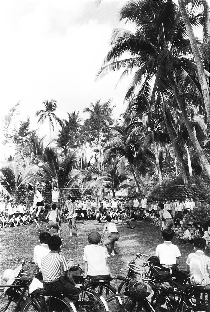 以前的排球场极其简陋,一张渔网、两根绳子,系在椰子树干上,就成了露天的排球场。这是老一辈文昌人的排球记忆,在他们的记忆里,小时候条件非常艰苦,大家想打排球了,只能用渔网当作球网,拿椰子当作排球。虽然露天排球场非常简陋,但却承载着他们童年最美好的时光。