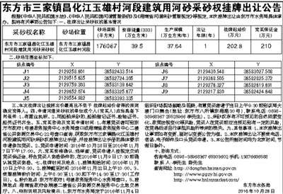 东方市三家镇昌化江玉雄村河段建筑用河砂采砂权挂牌出让公告