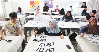 10月27日,在海南师范大学教室里,参加“汉语桥”秋令营的马来西亚学子在练习用毛笔写汉字,他们将在琼开展为期9天的汉语学习和中华文化体验。马来西亚是“一带一路”沿线重要国家,该活动旨在让学子在体验和交流中感受中国文化魅力,增进中马两国情谊。本报记者 张茂 摄