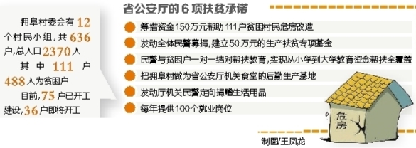10月24日,省公安厅迅速下拨筹集到的150万元危房改造补助款给拥阜村委会,111户建档立卡贫困户每户都领到了1.35万元危房改造补助款。目前,危房改造工作已经全面铺开,75户贫困村民住房已开工建设,余下的36户也即将开工,力争在2017年春节前完成全部危房改造。
