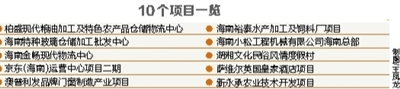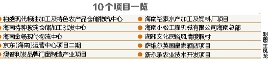 此次联合动工的十个项目,涉及海南(澄迈)金马现代物流中心、海南省琼台合作基地、海南福山咖啡文化风情镇3个园区,涵盖现代物流业、旅游地产业、先进制造业、热带高效农业等澄迈县优势产业,预计总投资为22.8亿元,其中,在百日大行动期间,计划将完成投资3.1亿元。
