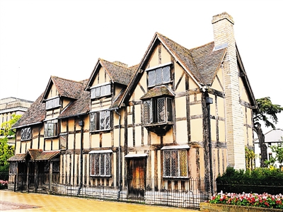 我仰望着这座在16世纪建筑的带有三角尖顶阁楼的二层楼房,它在19世纪重修过,保留了原先风貌。1564年4 月23日,莎士比亚诞生在这座阁楼里,52年后的同一天,又在这楼里辞世。由于莎士比亚,有人把这一天称为文学史上既悲伤又快乐的一天。