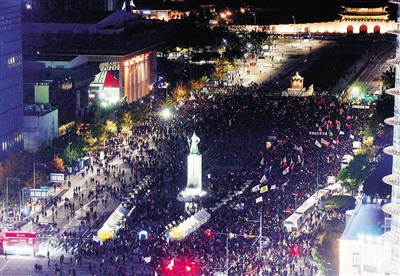 韩国多个市民团体29日晚共同在首尔市清溪川广场一带举行大规模烛光集会。据韩国媒体报道,主办方表示约有2万名民众参加集会,警方估计实际规模约为9000人。参加集会的民众高喊口号要求朴槿惠下台,并一度试图向青瓦台总统府行进,集会民众与警方发生对峙。主办方表示,将在11月12日组织更大规模的集会活动。