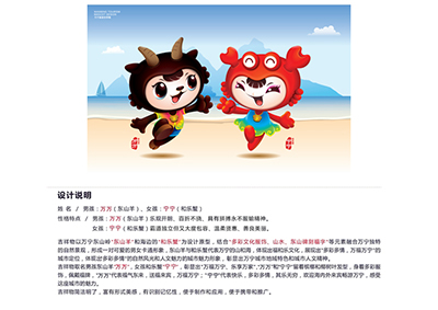这两个卡通以“山海相接、连峰耸翠、绚丽多姿、风情万种、朝气蓬勃、福寿康宁”的整体意象,紧扣“多彩多情,万福万宁”的自然风光和人文特色,通过抽象、概括、夸张等手段赋予其鲜活生动、精神饱满、萌态可掬的可爱形象,人见人爱。