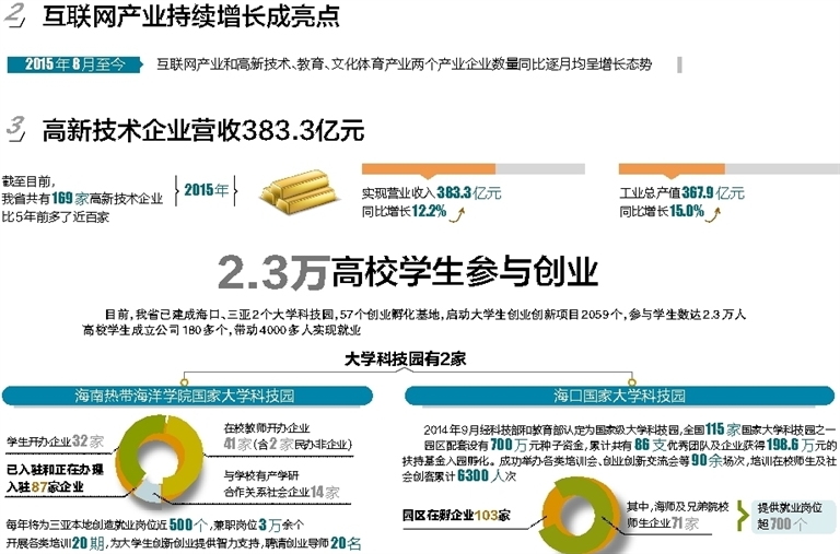 我省油气产业注册资本(金)呈现井喷式增长,医药产业呈现大幅度增长趋势;高新技术、教育、文化体育产业在企业数量增长的同时,呈现注册资本(金)稳健增长;房地产业企业数量健康发展,现代物流业企业数量保持持续增长态势;互联网创业创新活跃,新注册成立的互联网企业数量多。“大众创业、万众创新”正给海南经济发展带来源源不断的活力。