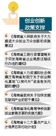 “大众创业、万众创新”的浓厚氛围,得益于相关部门的大力扶持。我省相继出台了《海南省人民政府关于大力推进大众创业万众创新的实施意见》等一系列政策措施,推动全省创业创新发展,计划到2020年全省创业创新型服务机构超过100家。