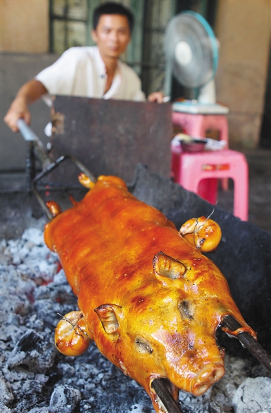 厨师会用调好的调料腌制洗净的整只乳猪,再用铁叉把乳猪固定好,涂上适量蜂蜜,放在炭炉上烤,边烤边翻转。开始火力可旺些,逐渐变成文火。待猪皮边硬后,用毛刷擦上香油再烤,猪皮变红就可食用,这样做的乳猪皮脆、肉嫩、骨酥、吃后满口留香。