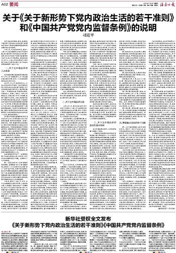 新华社受权全文发布 《关于新形势下党内政治生活的若干准则》 《中国共产党党内监督条例》