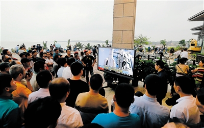 这是长征五号发射之前,观众们在文昌龙楼电视机屏幕前关注长征五号火箭发射的相关报道。 本报记者 张杰 摄