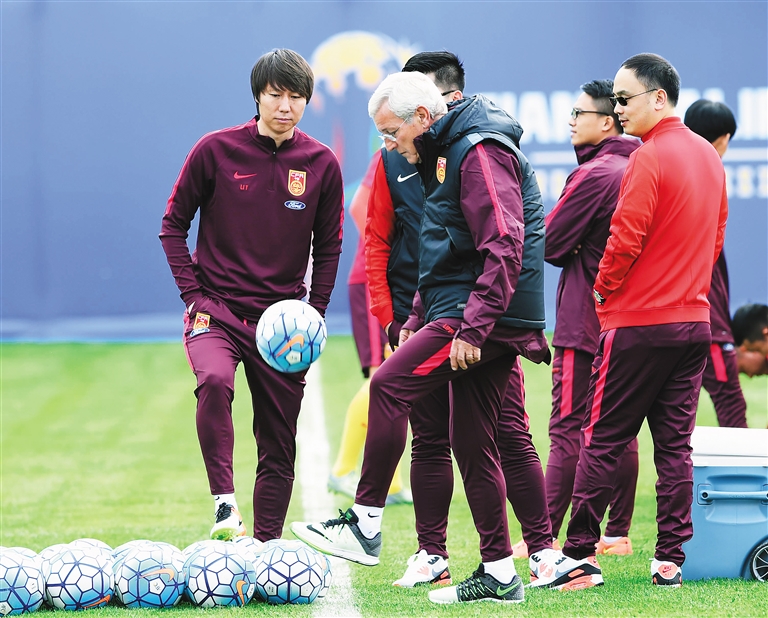 11月3日,主教练里皮(前排左一)率中国男子足球队在昆明海埂基地进行首场训练,以备战11月15日与卡塔尔队的俄罗斯世界杯亚洲区预选赛12强赛。 新华社发
