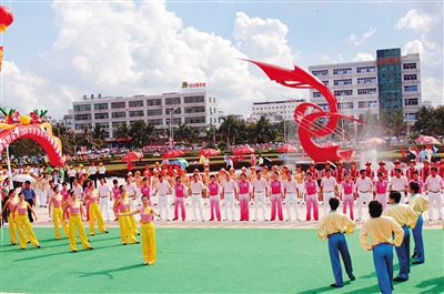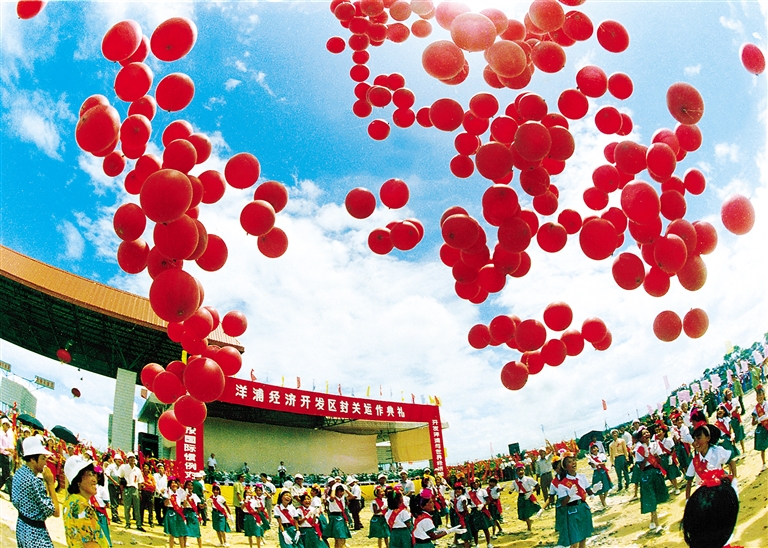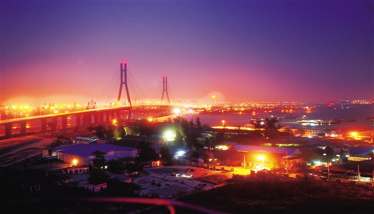 敢为人先:1989年,“洋浦风波”引发了“爱国”与“卖国”的争论,成片开发项目一度偃旗息鼓。1992年3月国务院正式批准设立洋浦经济开发区,1993年9月,洋浦经济开发区举行封关运作典礼。一幅《洋浦封关庆典》,把历经坎坷终成正果的愉悦情感通过浓烈、轻松、喜庆的画面宣泄出来了。如今洋浦已成为海南省重要的经济增长极和中国对外开放的重要窗口。一幅《洋浦跨海大桥夜景》,把洋浦的辉煌映照得一览无余。